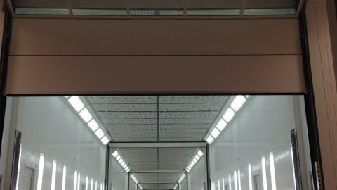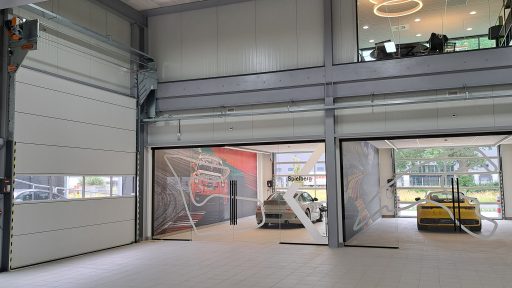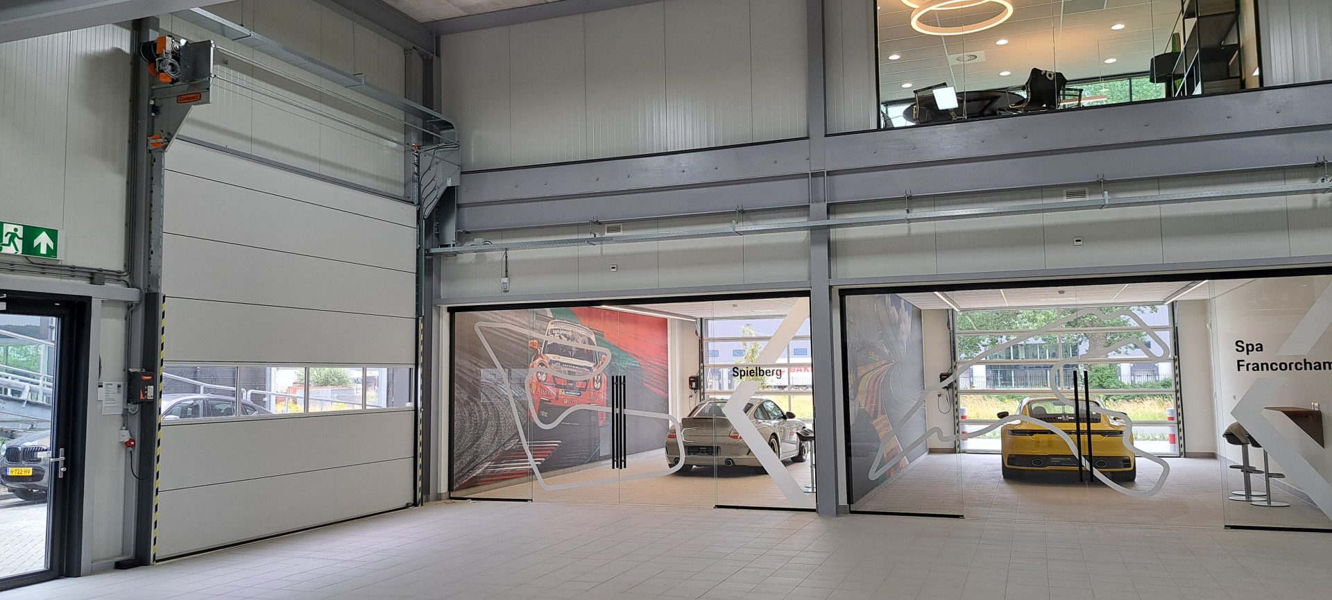 Compact-porten folder sine paneler op mod loftet. Disse kan nemt skjules i et sænket loft.