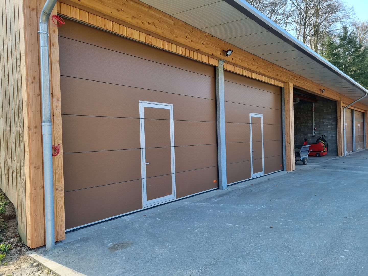 Foldeportene er designet, så de passer perfekt til loftet og foldes sammen næsten lydløst. Dette er muligt takket være specielle hængsler og skinner, der sikrer, at portene bevæger sig smidigt. Disse hængsler er placeret mellem panelerne, så de ikke er synlige udefra eller indefra. Leddportene passer farvemæssigt perfekt til den smukke facade på den indenports ridehal og giver bygningen det sidste finish.