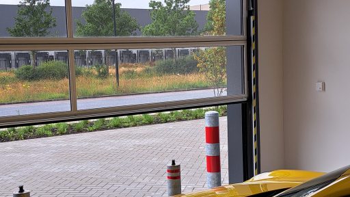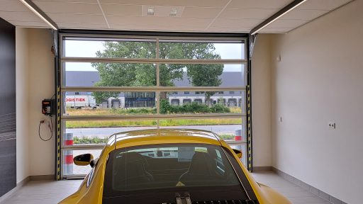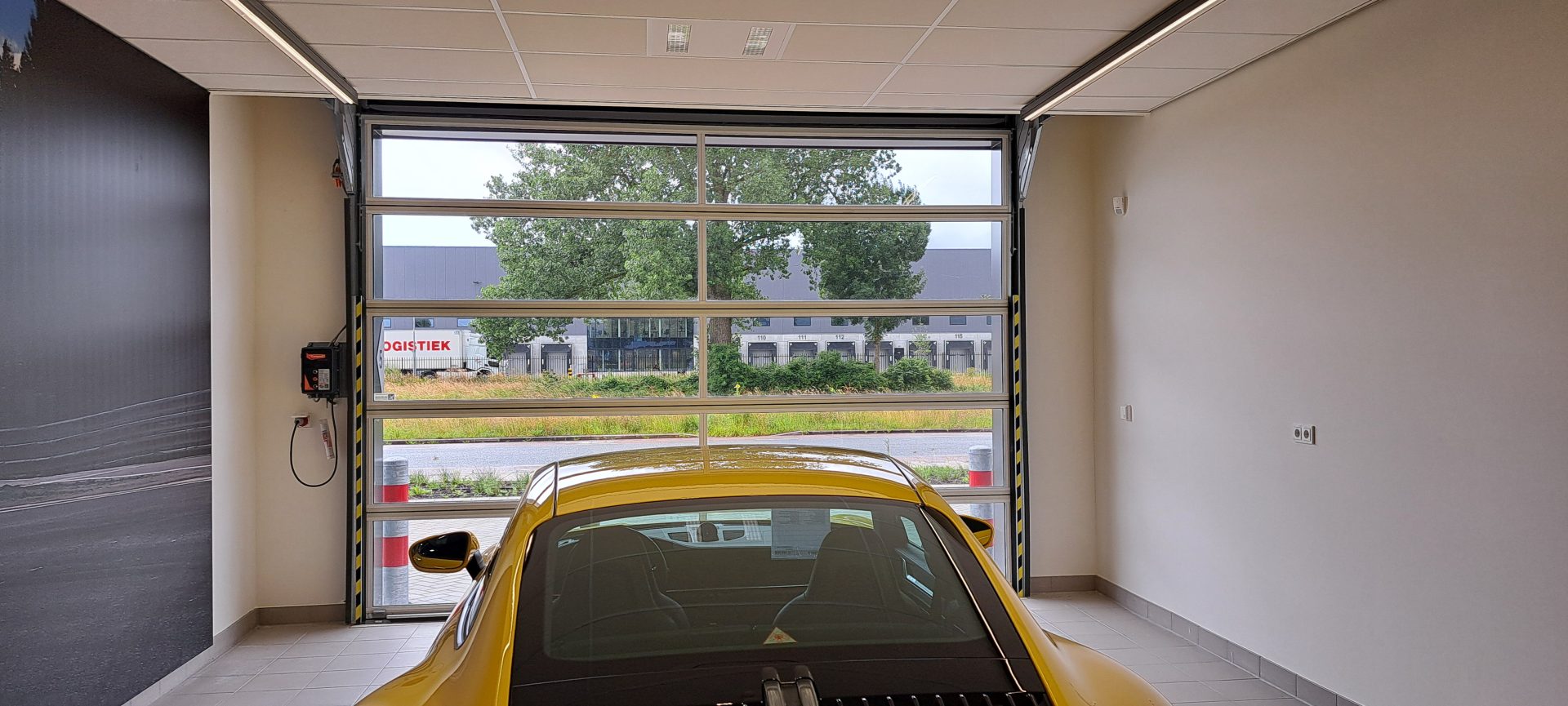 Porsche Centrum Twente lægger stor vægt på bygningens finish. Naturligvis skal opmærksomheden straks være fuldt fokuseret på de Porscher, der udstilles her. Compact-porten er monteret i bygningens leveringsrum, hvor kunderne snart kan beundre deres nye køretøj for første gang. Her ønskede forhandleren en luksuriøs udstråling, der gør de smukke biler retfærdighed. Da Compact-porten takket være det smarte foldesystem kunne skjules pænt i loftet, var dette det ideelle valg.