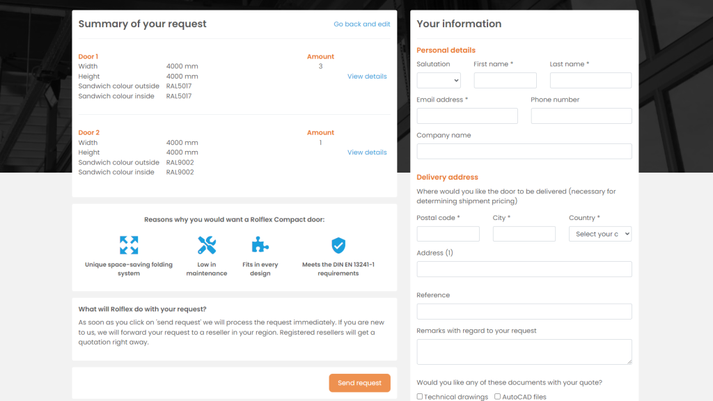 Nu kan du gennemgå din forespørgsel igen og indtaste dine kontaktoplysninger, så vi kan sende dig et gratis tilbud. Du er velkommen til at notere eventuelle særlige ønsker eller spørgsmål i kommentarfeltet. Du kan også angive, om du ønsker tekniske tegninger, AutoCAD-filer eller arkitektoniske specifikationer for din dør. Når du har udfyldt alt, kan du sende forespørgslen, og du vil snart modtage et helt uforpligtende tilbud samt de ønskede filer.
