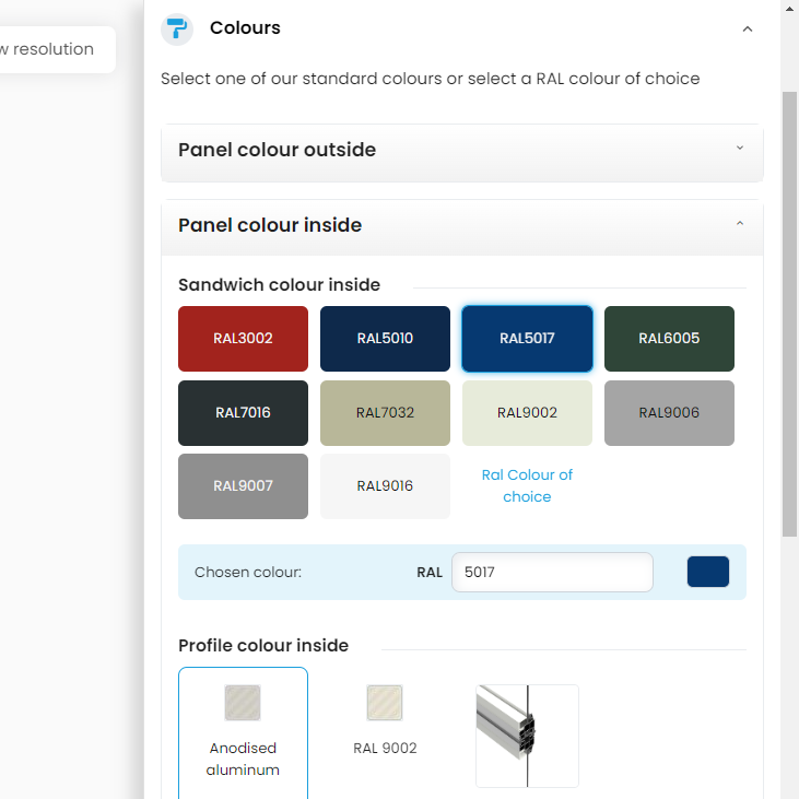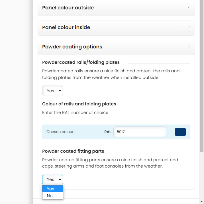 Du kan også angive her, om du ønsker andre dele pulverlakeret. For eksempel skinnerne og foldepladerne. Dette er valgfrit.