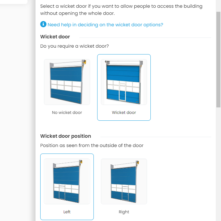Hvis du ønsker en gangdør i porten, kan du angive dette her. Du kan også vælge, hvor gangdøren skal placeres, om den skal åbne indad eller udad, og på hvilken side hængslerne skal sidde. Læs mere om gangdøren og de mulige placeringer.