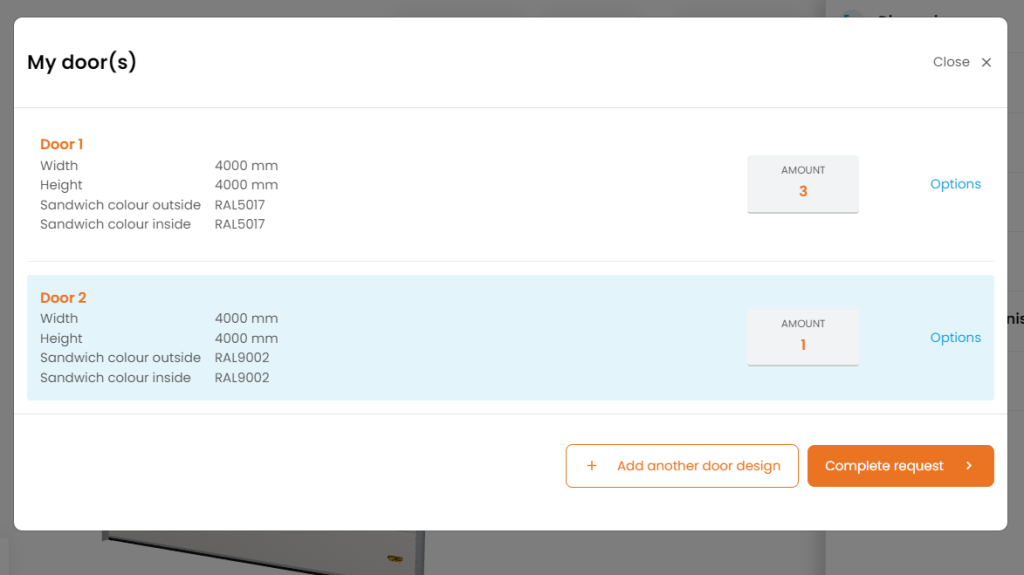 Når du er færdig, skal du klikke på »Næste« eller »Mine porte« for at gå til din oversigt. Her kan du angive antallet af porte eller tilføje yderligere portdesign. Hvis du er tilfreds med dit valg, skal du klikke på »Afslut forespørgsel« for at indtaste dine data i næste trin.