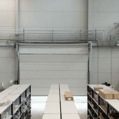 Da sich die isolierte Paneele beim Compact Hallentor über der Toröffnung zu einem kleinen Paket übereinander aufstapeln, gibt es keine Schienen an der Decke. So ist dank dem Falttor mehr Platz für hohe Regale sowie verschiedene Installationen vorhanden.
