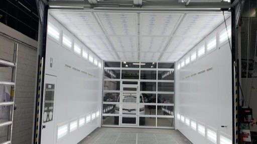 In einer Lackierkabine darf der Raum nicht durch bewegliche Teile gestört werden, die Staub in den Raum bringen können. Die Compact-Tor faltet sich an der Außenseite der Kabine zusammen, wodurch Sie nicht nur Platz im Inneren sparen, sondern auch keine beweglichen Teile im Raum vorhanden sind und dieser sauber bleibt. Auch aus diesem Grund hat sich Garmat, der Lieferant von Lackierkabinen für Carcenter Zeebrugge, für diese Compact-Lackierkabinentor entschieden.