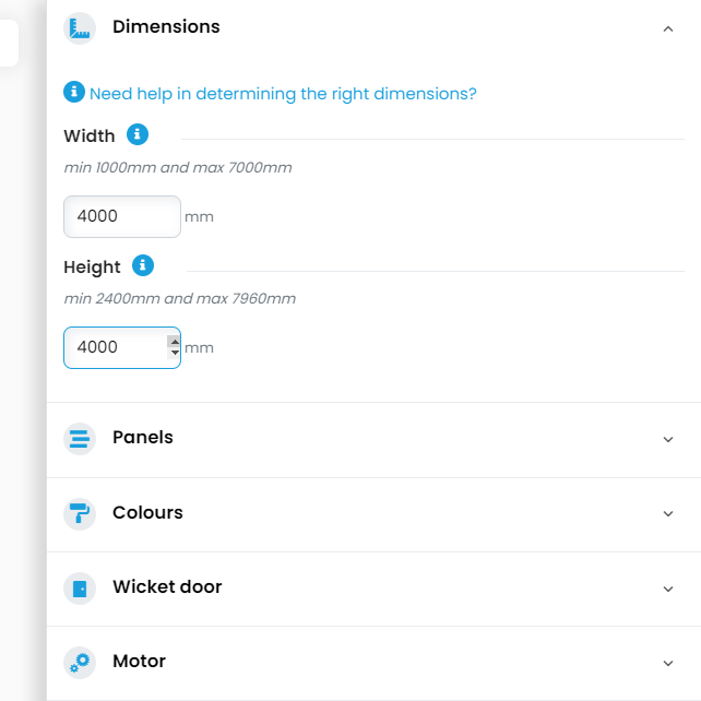 En primer lugar, introduzca las dimensiones de la puerta que necesita. Recuerde que también necesita espacio alrededor de la abertura de la puerta. Lea el artículo «¿Cuánto espacio libre necesito alrededor de la puerta Compact?» para obtener más información.