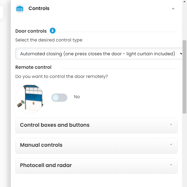 Por último, puede decidir el tipo de control y funcionamiento. Hemos seleccionado el «cierre automático» como opción estándar. Esta opción incluye una cortina de luz para mayor seguridad.