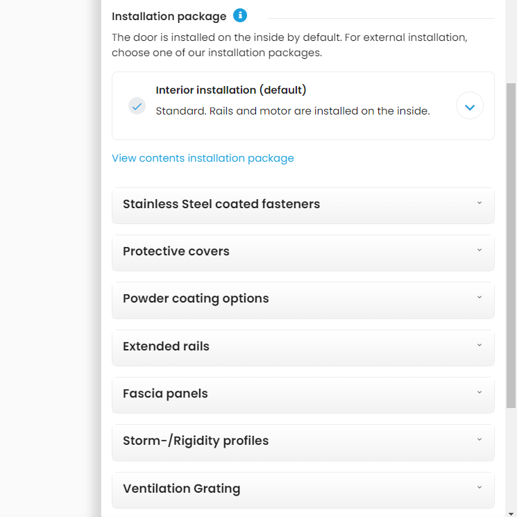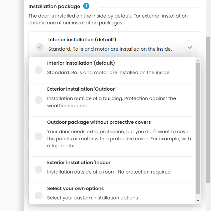 Por lo general, la puerta se instala en el interior del edificio. Sin embargo, también se puede montar en el exterior de una habitación dentro del edificio (instalación exterior «interior») o completamente fuera del edificio. Si se instala en el exterior, algunas partes de la puerta deben protegerse de las inclemencias meteorológicas con una cubierta protectora y otras medidas de protección (instalación exterior «exterior»). Si el paquete de la puerta y el motor están cubiertos por un techo, no se requiere ninguna cubierta protectora (paquete para exteriores sin cubiertas protectoras). Si ninguno de los paquetes de instalación se ajusta a sus necesidades, también puede seleccionar usted mismo las opciones de instalación.