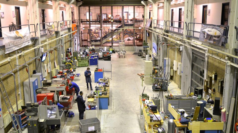 En el «Dreamhall» de la Universidad Técnica de Delft se han instalado 10 puertas basculantes compactas que ahorran espacio para mantener la máxima altura del suelo y el techo, y así cumplir con los requisitos técnicos y estéticos de un entorno de trabajo y de equipo de carreras de alta tecnología.
