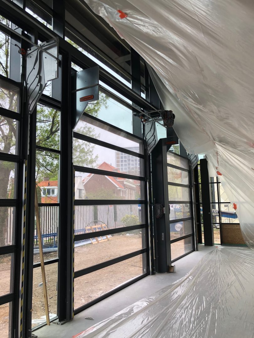 La mayor ventaja de la puerta basculante Compact es que, gracias a su sistema plegable, no necesita rieles en el techo. Esto permite instalar esta puerta industrial sin que los rieles o la puerta abierta obstaculicen, por ejemplo, los puentes elevadores. Además, hay ventanas encima de las puertas y la puerta no bloquea la entrada de luz cuando se abre. Este proyecto lo lleva a cabo la empresa constructora Binx.