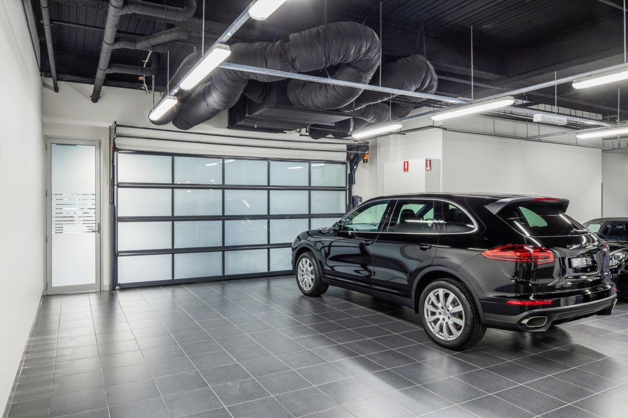 El concesionario de Melbourne ha utilizado la puerta de garaje Compact en su enorme edificio para cerrar varios espacios. De este modo, el taller se puede cerrar con una puerta de garaje totalmente transparente, lo que permite a los clientes ver a los distintos técnicos trabajando. Las zonas de lavado de coches y la sala de exposición también se cierran con la puerta Compact. La puerta de garaje Compact, aquí con paneles de cristal, mantiene el aspecto impecable y lujoso del edificio tanto cuando está cerrada como abierta.