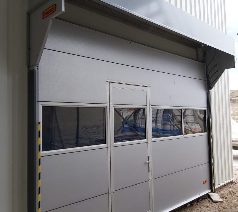 En Fermacell, fabricante de placas de fibra de yeso, entre otros productos, hemos instalado recientemente dos puertas Compact con puerta peatonal. Ambas puertas están compuestas por paneles sándwich en color RAL 9006 y un panel totalmente transparente a la altura de los ojos. Para ahorrar espacio, el cliente nos pidió que instaláramos las puertas en el exterior del edificio. Con esta solución, la puerta enrollable de la nave industrial no ocupa espacio en el interior del edificio, lo que permite utilizar ese espacio para, por ejemplo, instalaciones. La puerta, de casi 8 metros de altura, está equipada con perfiles de tormenta para reforzar la hoja de la puerta.