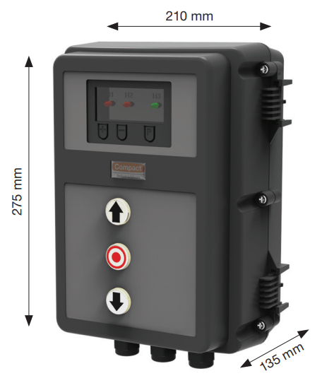Compact-porten leveres som standard med en kontrollboks med dødmannsknapp. Denne knappen må holdes inne til porten er helt lukket.