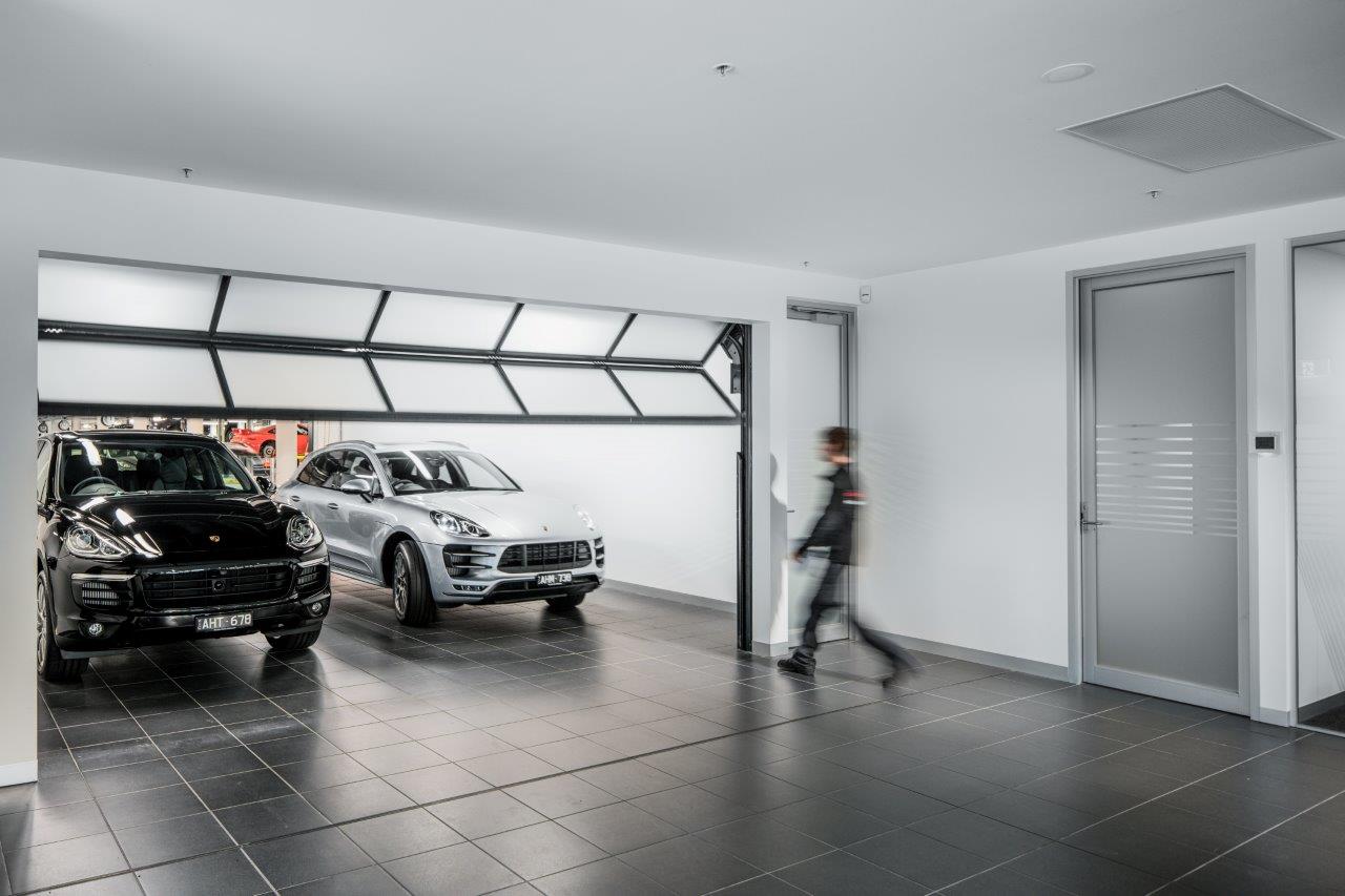 Compact-garasjeporten er brukt av forhandleren i Melbourne i det enorme bygget for å skille av ulike rom. På denne måten kan verkstedet skilles av med en helt gjennomsiktig garasjeport, som lar kundene se de ulike teknikerne som er i arbeid. Også bilvaskene og utstillingslokalet skilles av med Compact-porten. Compact-garasjeporten, her utført med glasspaneler, sørger for at bygningens rene og luksuriøse utseende opprettholdes både når den er lukket og åpen.