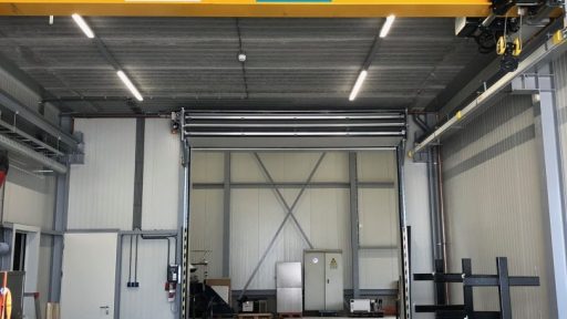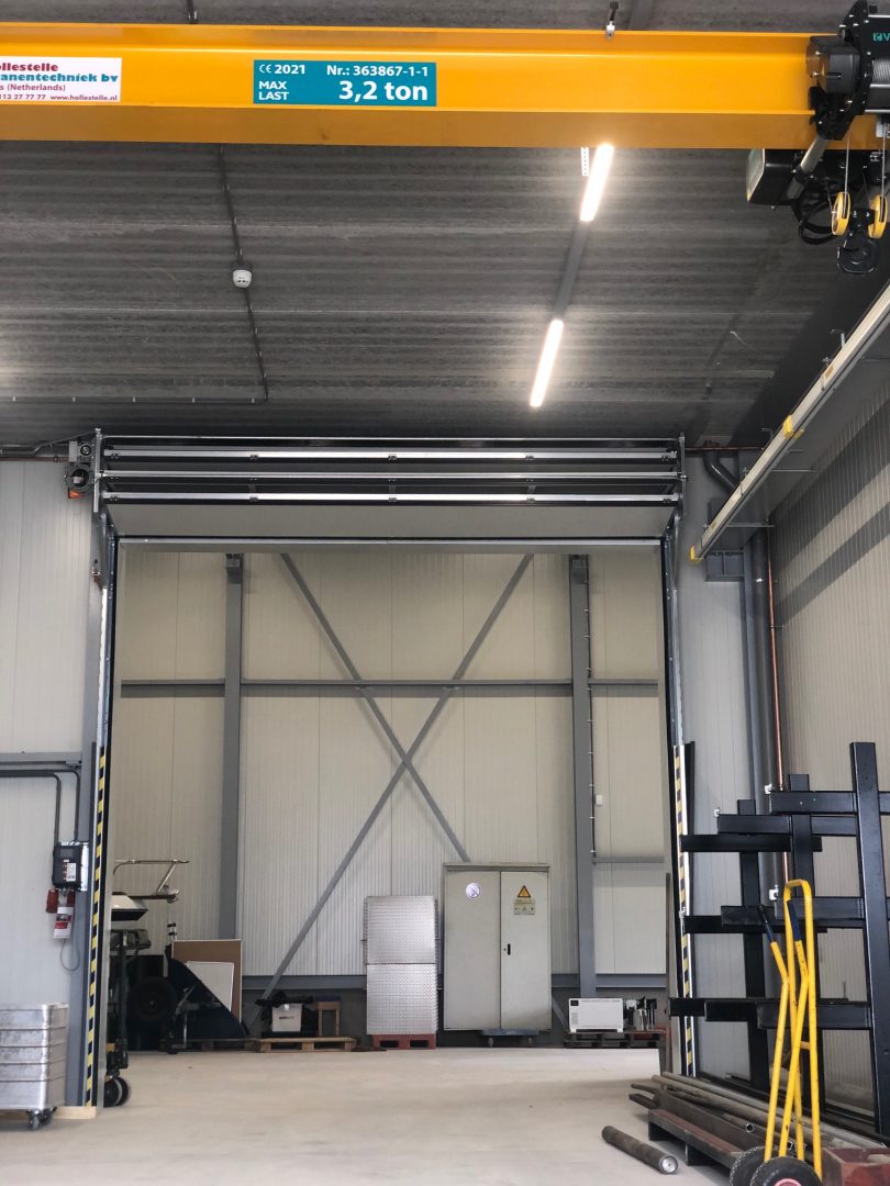 Som tidigare nämnts valde Kabelwerken van Dorp B.V. vår industridörr eftersom det fanns belysning och kranbanor bakom dörren. De utrymmesbesparande egenskaperna hos Compact-porten kom väl till pass här. Tack vare vikningssystemet, där portpanelerna viks upp ovanför porten, förblir taket fritt och belysningen blockeras inte vid öppning. På så sätt kan allt utrymme direkt bakom porten utnyttjas. Med en konventionell takskjutport skulle det behövas skenor i taket för att öppna porten längs taket. Detta skulle blockera belysningen och kranbanan skulle inte kunna gå hela vägen fram till porten.