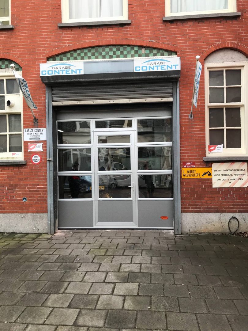 Våra montörer installerade Compact-rullporten hos detta garageföretag i Haarlem. Den befintliga gamla porten behövde bytas ut och Compact-rullporten med gångdörr visade sig vara den perfekta lösningen för denna fastighet. Direkt bakom porten finns nämligen en bilbro, vilket gör att Compact-portens kompakta inbyggnadsutrymme kommer väl till pass (inga takskenor, så utrymmets höjd utnyttjas fullt ut).